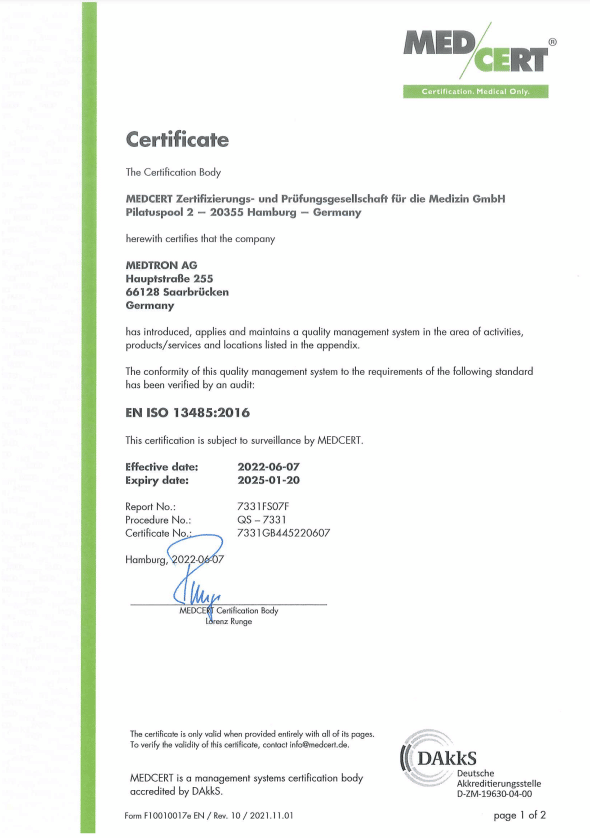 Zertifikat EN ISO 13485:2016 + AC:2018 + A11:2021