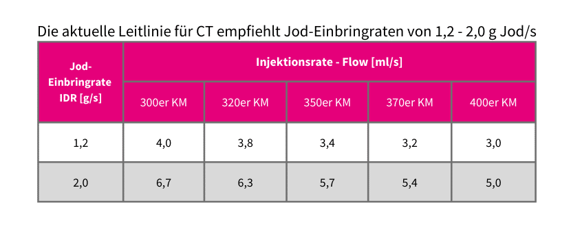 Tabelle über die aktuelle Leitlinie für CT empfiehlt Jod-Einbringraten von 1,2 - 2,0 g Jod/s