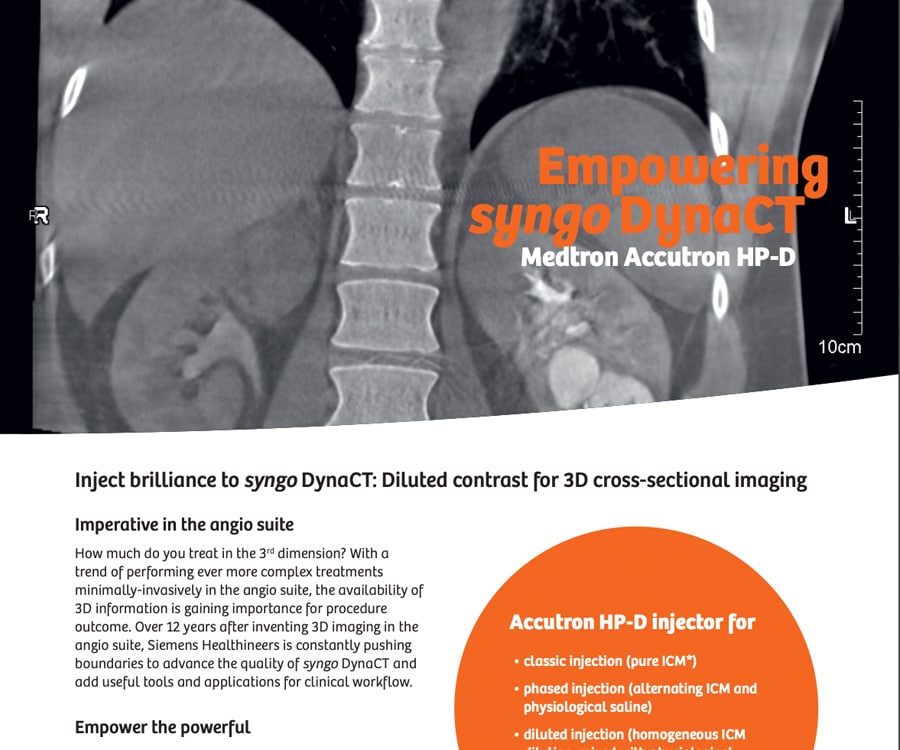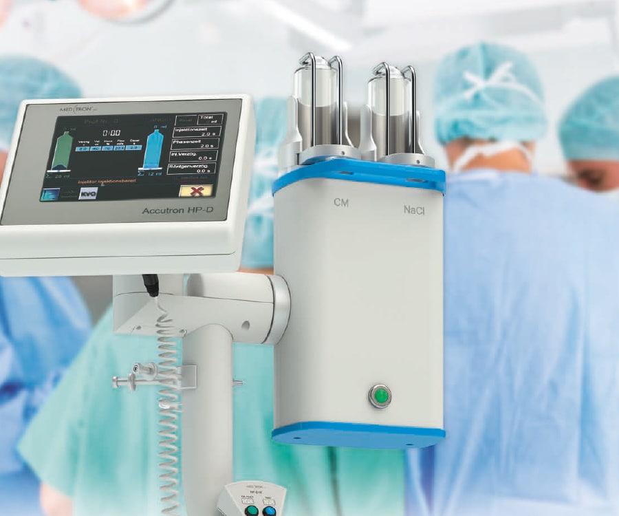 Accutron® HP-D это настоящий универсал: двухколбовый инъектор контрастного вещества, предназначенный для точного введения контрастного вещества и физиологического раствора веществ при ангиографических процедурах с инъекциями высокого давления, но также может использоваться при компьютерной томографии. Особенно хорошо этот аппарат проявляет себя в 3D-ангиографии и конусно-лучевой компьютерной томографии, в частности, благодаря его способности выполнять протоколы многофазной инъекции, а также возможности регулировать концентрацию контрастного вещества с одновременным введением физиологического раствора. Он имеет специальный режим КТ для внутривенных инъекций и оптимизирован для КТ с плоскими детекторами.