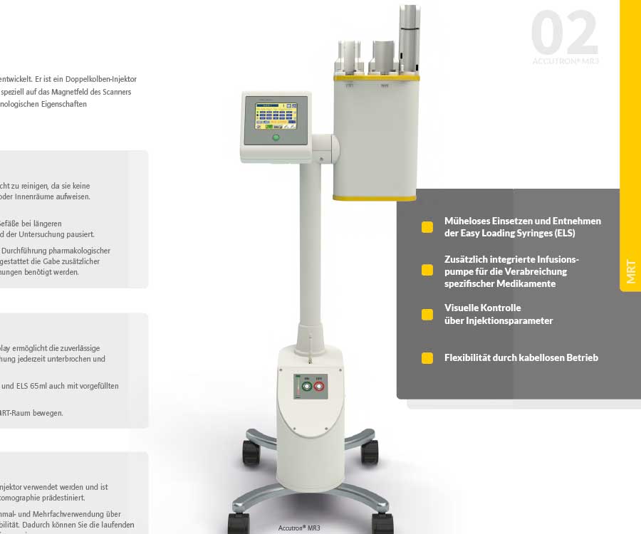 Entdecken Sie unseren Produktkatalog, Broschüren, Flyer und weiterführende Informationen zum Downloaden rund um unsere Produktebereiche der Kontrastmittelinjektoren und Verbrauchsmaterialien. Alle unsere Informationsmaterialien finden Sie in Deutsch und Englisch. Darüber hinaus sind auch einige Materialien in Spanisch, Französisch, Chinesisch, Italienisch und Portugiesisch für Sie verfügbar.