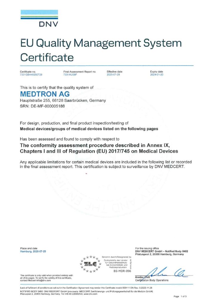 Certificate MDR Annex IX, Chapters I and III of Regulation (EU) 2017/745 on Medical Devices (class IIa)